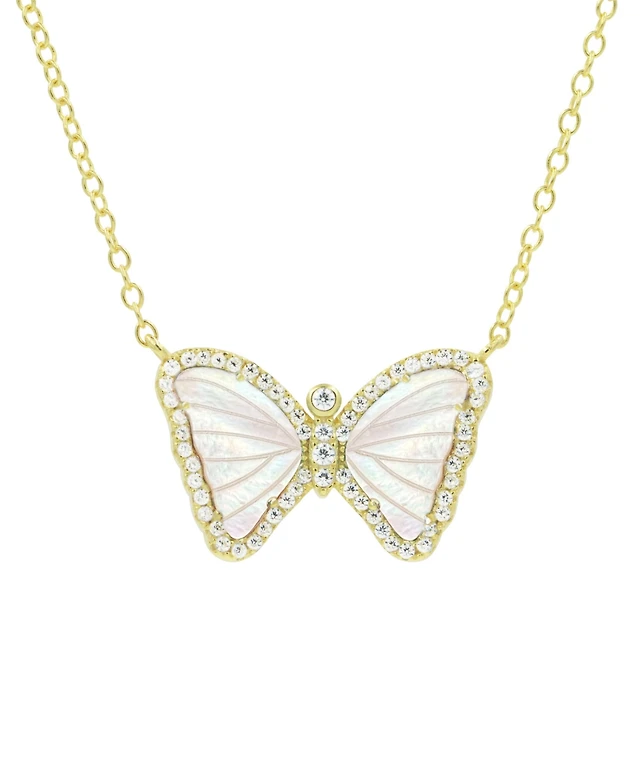 Mother of Pearl Cubic Zirconia Butterfly Pendant 18" Necklace in Gold Plate