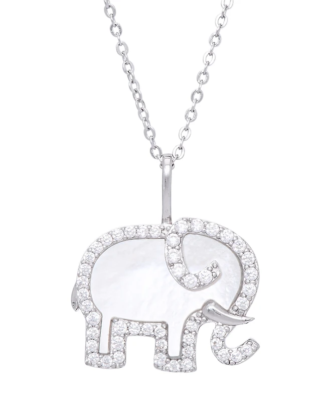 Mother of Pearl Cubic Zirconia Elephant Pendant 18" Necklace in Silver Plate