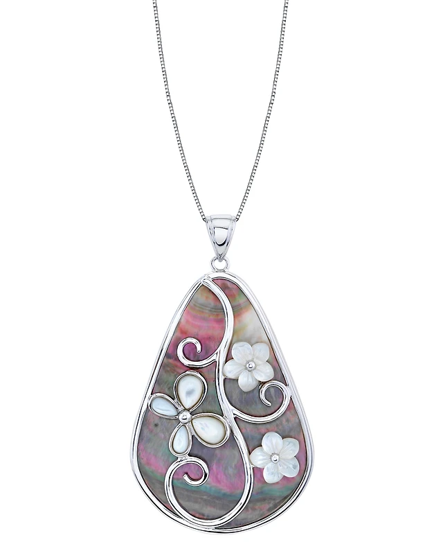 Black & White Mother of Pearl Flower 18" Pendant Necklace in Sterling Silver