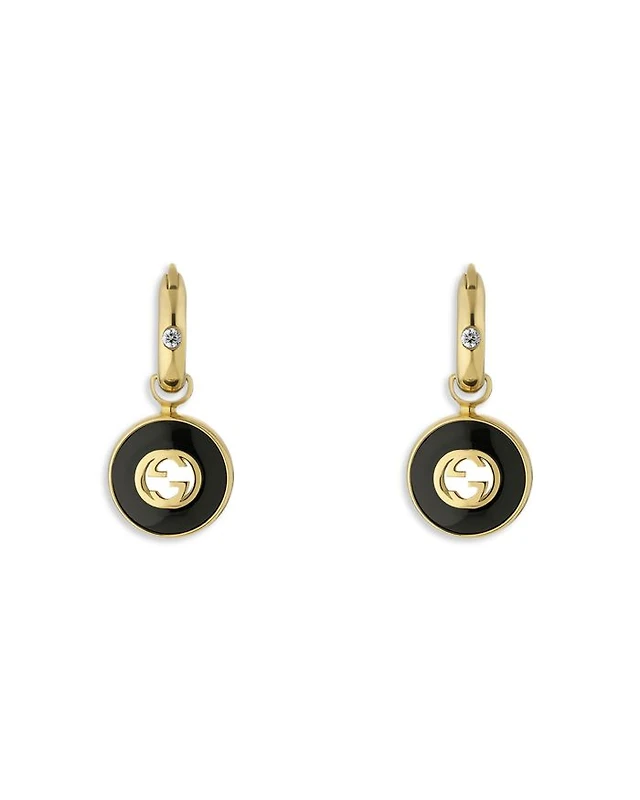 18K Yellow Gold Interlocking Onyx & Diamond Dangle Hoop Earrings
