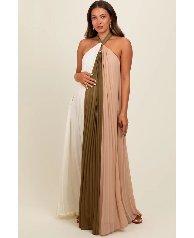 Pinkblush Maternity Olive Colorblock Pleated Halter Neck Maxi Dress