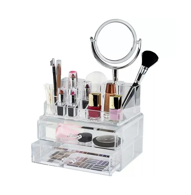 Clear Makeup Organizer with Vanity Mirror, 15 Easily Sort Compartments & 2 Drawers, Acrylic Compact Makeup Organizer for Cosmetics & Jewelry