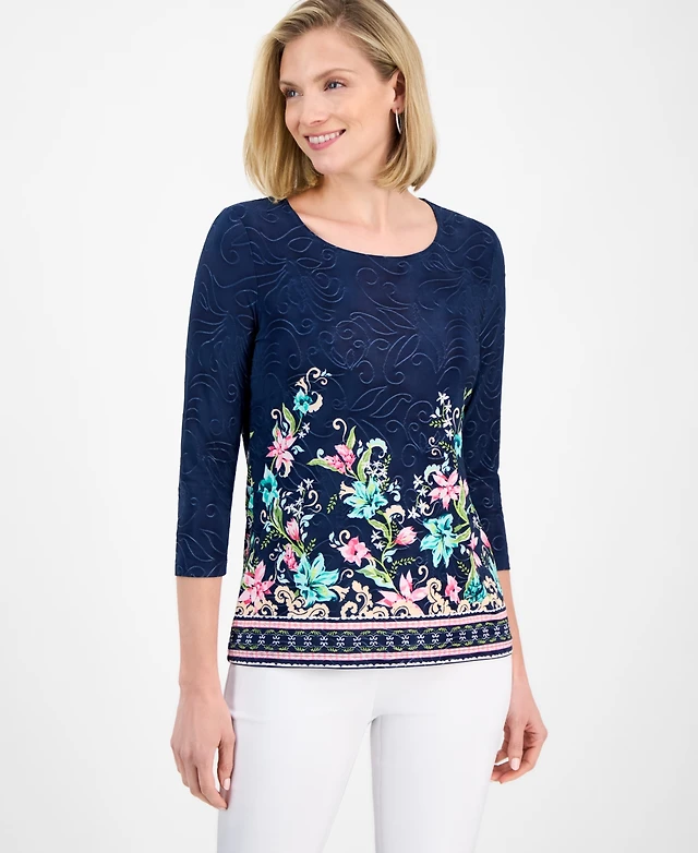 Jm Collection Women's Printed Jacquard 3/4-Sleeve Top, Exclusively at Macy's