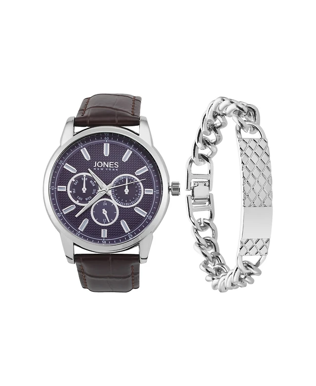 Jones New York Men's Analog Brown Polyurethane Strap Watch, 44mm and Bracelet Set