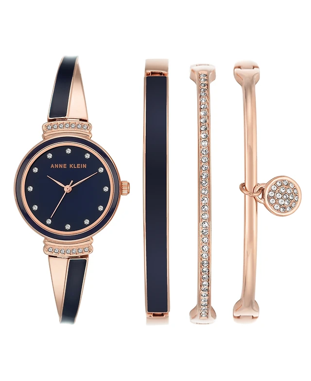 Anne Klein Women's Gold-Tone Alloy Bracelet with Black Enamel and Crystal Accents Fashion Watch 34mm Set 4 Pieces
