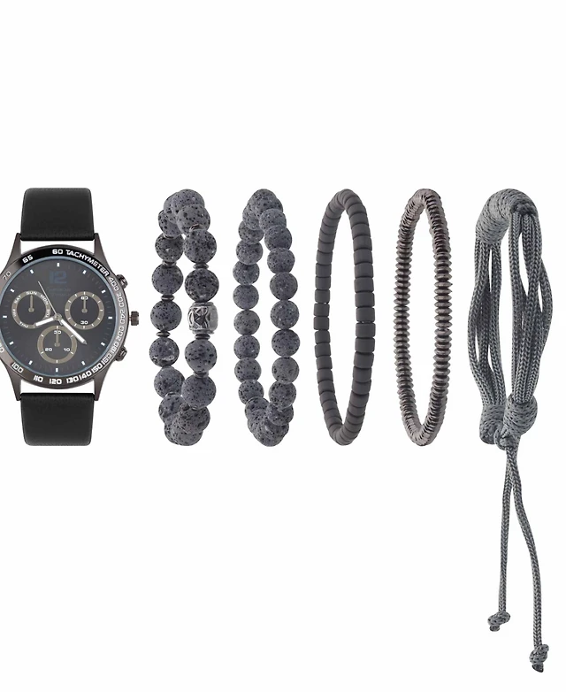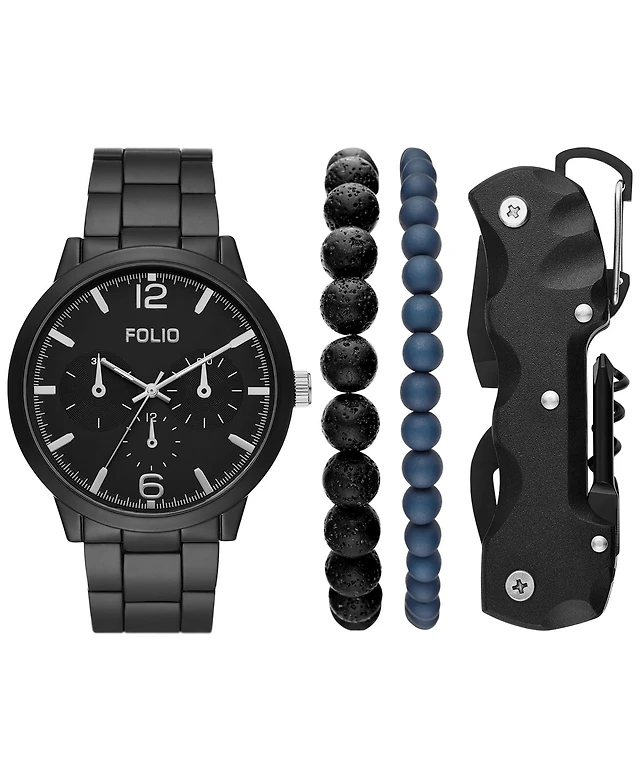 Men's Black Stainless Steel Bracelet Watch Gift Set 46mm