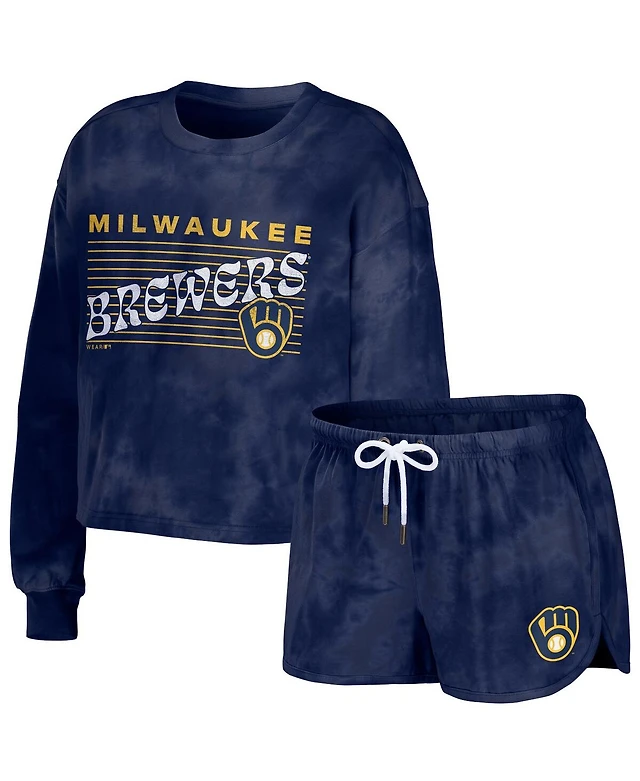Women's Wear by Erin Andrews Navy Milwaukee Brewers Tie-Dye Cropped Pullover Sweatshirt and Shorts Lounge Set