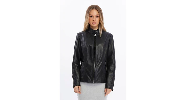 Cole Haan Women's 20 1/2” Moulded Collar Asymmetric Leather Jacket