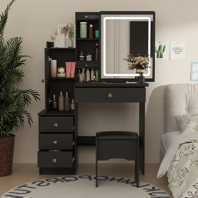 Famapy 5-Drawers Black Wood Led Push-Pull Mirror Makeup Vanity Sets Dressing Table Sets with Stool and 3-Tier Storage Shelves