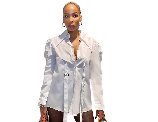 8586: OFF THE SHOULDER CROP BUTTON UP SHIRT