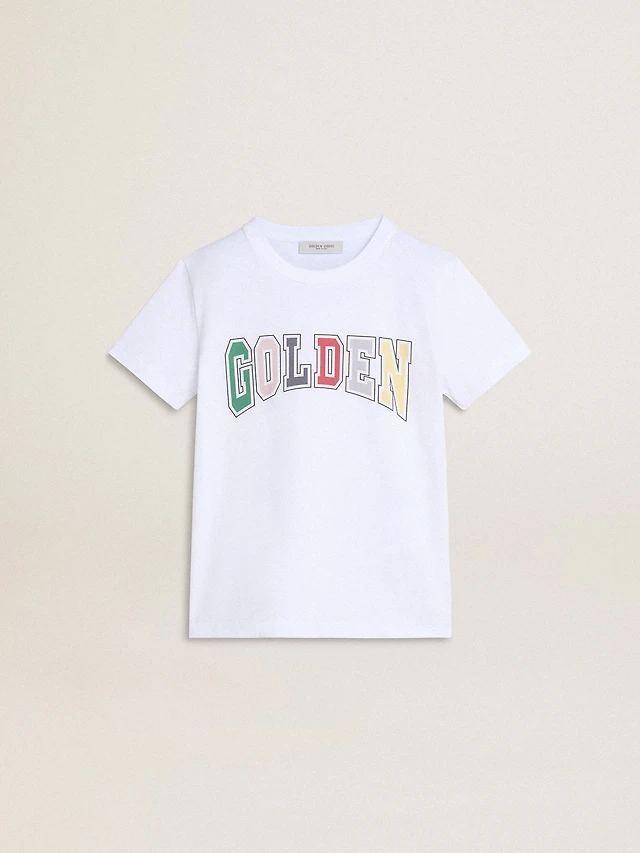 Men's aged white cotton T-shirt with gold print