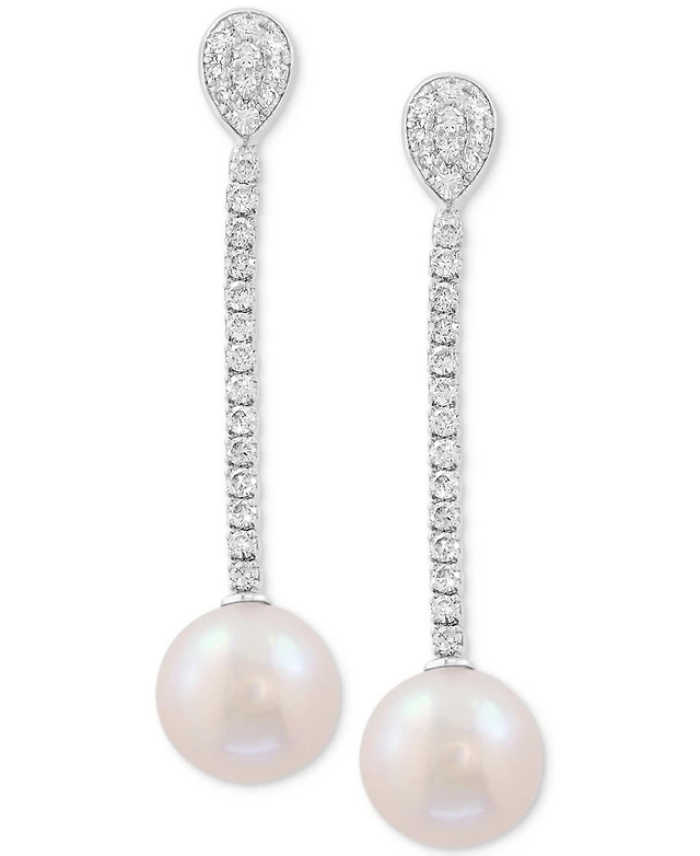 Bling Jewelry Simple Cz White Freshwater Cultured Pearl Linear Chain Dangling Earrings Silver Plated Brass