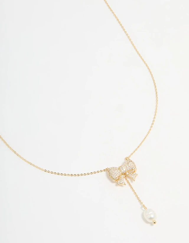 Gold Plated Pearl & Cubic Zirconia Chunky Bow Y-Necklace