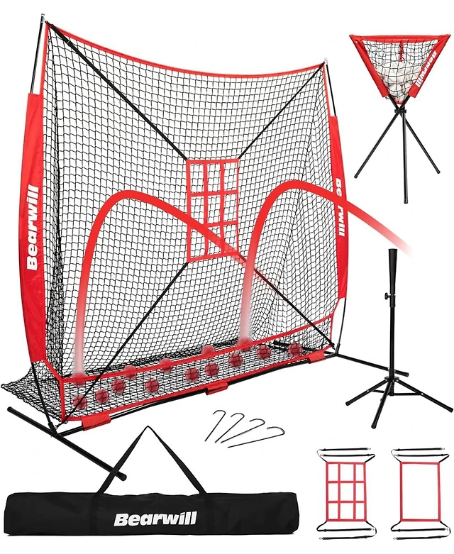 Bearwill 7x7ft Baseball & Softball Net - Pitching, Hitting & Batting Practice Set with Ball Collection System, Tee, 2 Strike Zones & Carry Bag