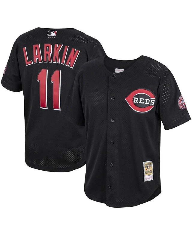 Men's Mitchell & Ness Barry Larkin Black Cincinnati Reds Cooperstown Collection Mesh Batting Practice Button-Up Jersey