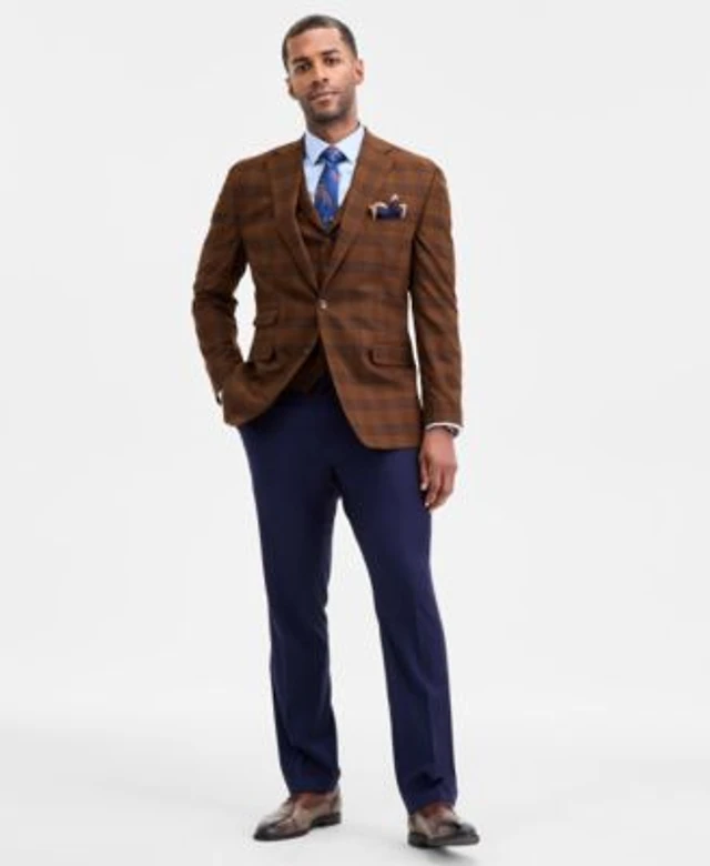 Tayion Collection Mens Classic Fit Brown Navy Plaid Suit Separate Jacket Vest