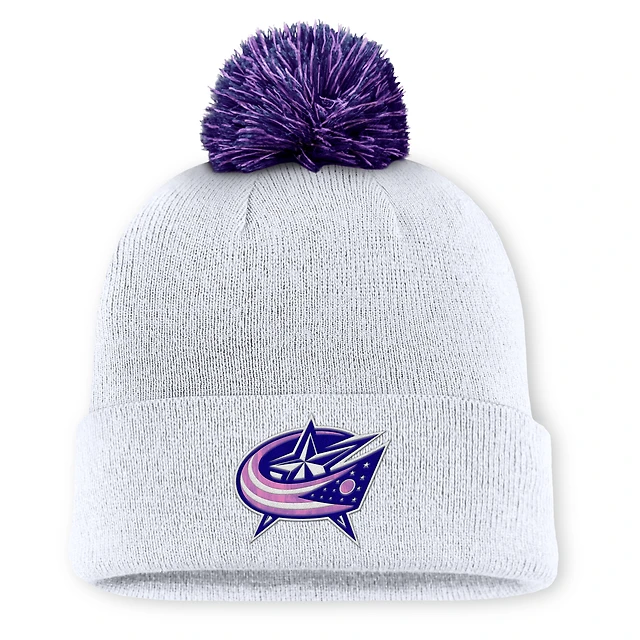 Men's Fanatics White Columbus Blue Jackets Authentic Pro Hockey Fights Cancer Cuffed Knit Hat with Pom