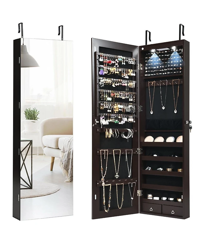 Door Mounted Lockable Mirrored Jewelry Cabinet with Led Lights