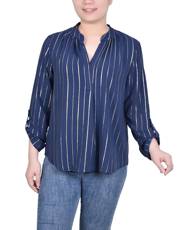 Ny Collection Petite Long Sleeve Foil Striped Blouse