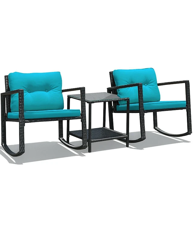 Gymax 3 Piece Outdoor Rocking Set Rattan Rocking Chair Set w/ Tempered Glass Table Seat