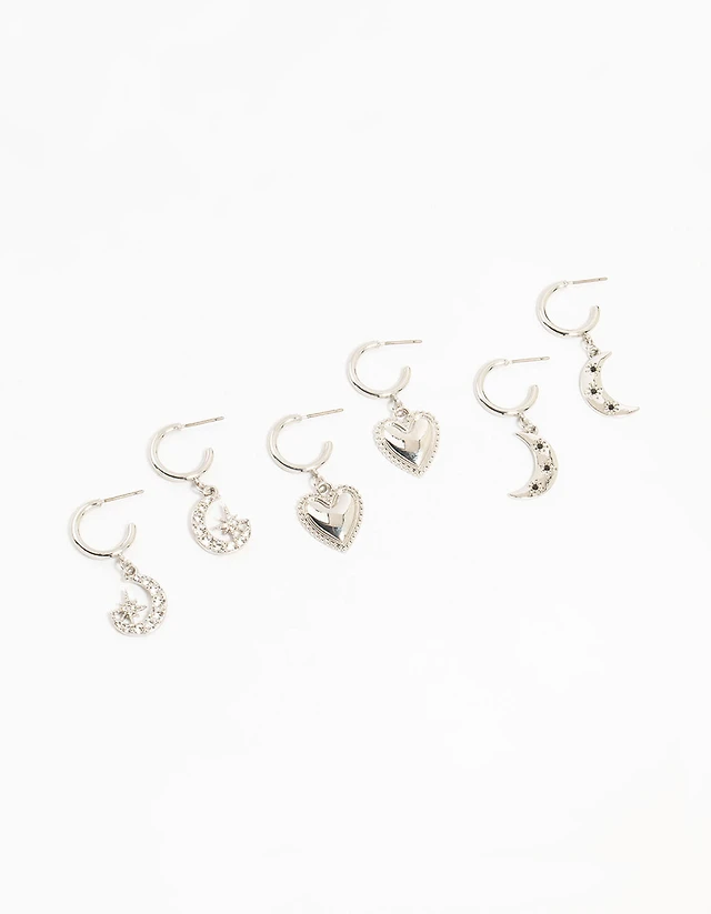 Silver Plated Heart, Moon & Star Hoop Earrings 3-Pack