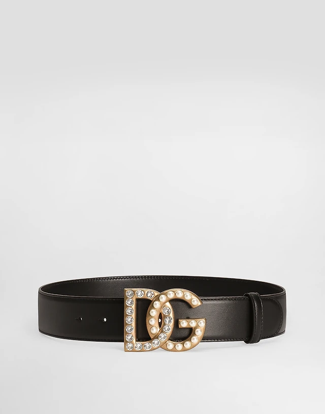 Calfskin belt with DG logo rhinestones and pearls