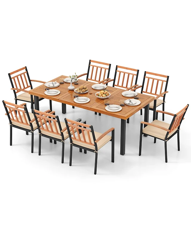 Gymax 3 Pcs Outdoor Dining Set for 6 w/Acacia Wood Tabletop Metal Frame Umbrella Hole