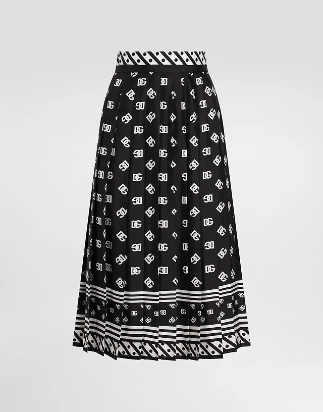Pleated silk twill calf-length skirt with all-over DG logo scarf print