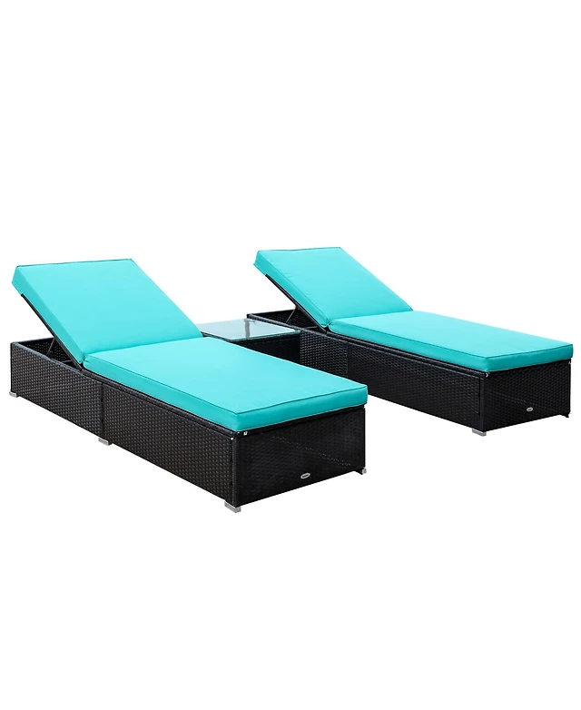 Outsunny 3 Piece Rattan Wicker Chaise Lounge Set, Cushioned Poolside Reclining Lawn Chairs with Tempered Glass Outdoor Side Table, Teal