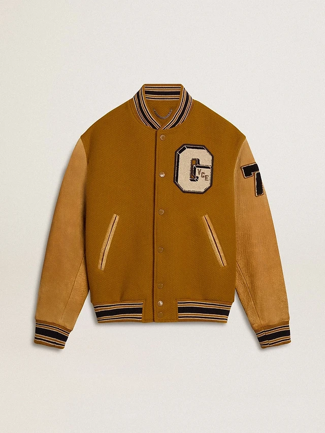 Beige bomber jacket with leather and patch details
