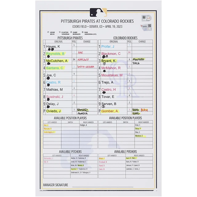 Pittsburgh Pirates Game-Used Lineup Card vs. Los Angeles Dodgers on April 25, 2023