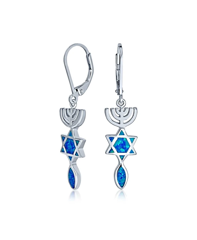 Bling Jewelry Created Blue Opal Religious Judaica Menorah Hanukkah Star Of David Leverback Dangle Earrings Bat Mitzvah Sterling Silver