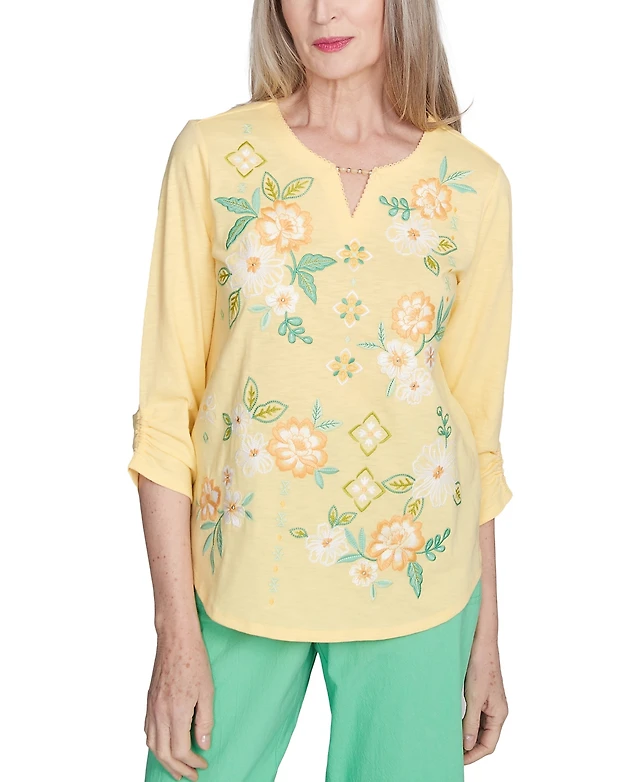 Alfred Dunner Women's Rise Shine Sunny Floral Embroidered Split Neck Top