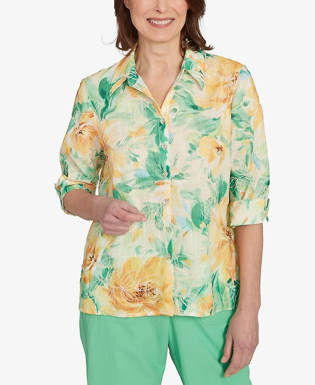 Alfred Dunner Petite Rise & Shine Watercolor Floral Tie Sleeve Button Down Top