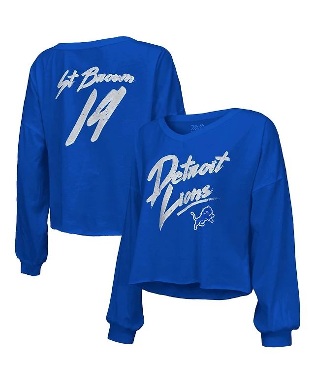Majestic Women's Amon-Ra St. Brown Blue Detroit Lions Name Number Off-Shoulder Script Cropped Long Sleeve V-Neck T-Shirt