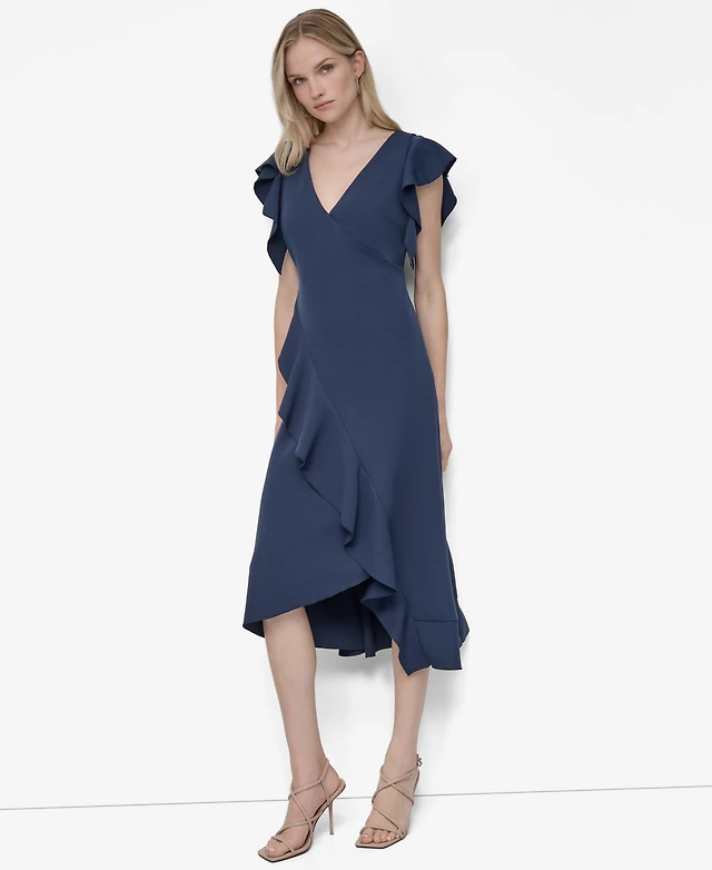 Mac Duggal Women's Long Sleeve V Neck Mesh Micro Ruffle Midi Dress