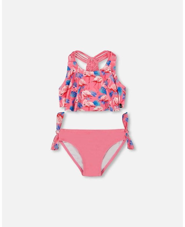Deux par Girls Printed Two-Piece Swimsuit With Frills Candy Pink And Flamingo