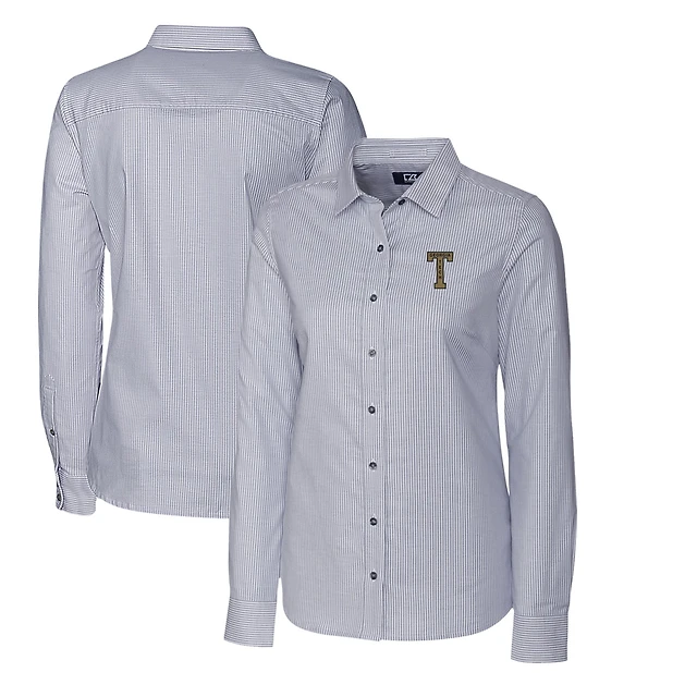 Women's Cutter & Buck Charcoal Georgia Tech Yellow Jackets Oxford Stripe Stretch Long Sleeve Button-Up Shirt