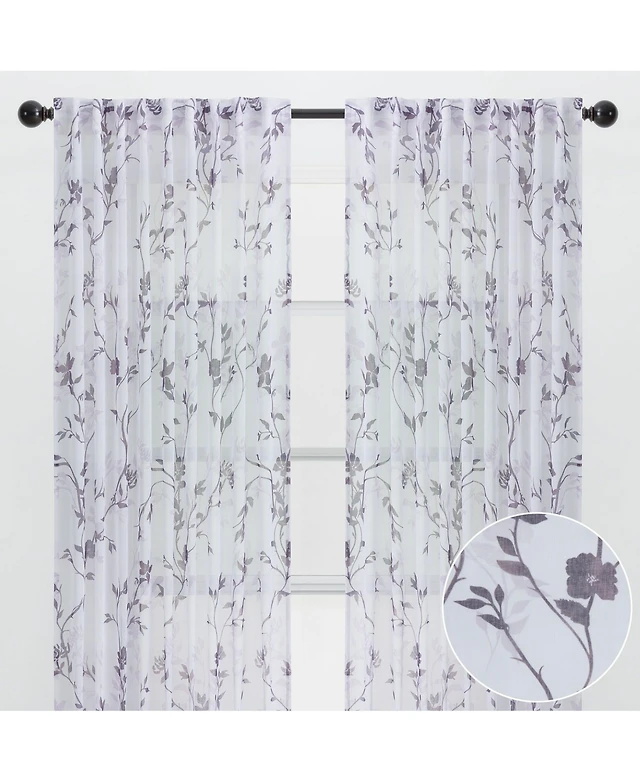 Kate Aurora Gray 4 Piece Rod Pocket Semi Sheer Floral Window Curtain Panel Set