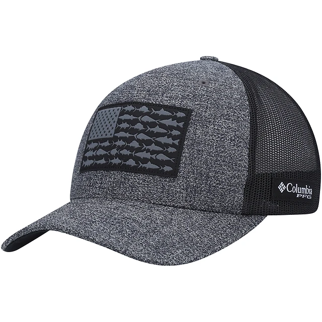 Men's Columbia PFG Heathered Charcoal/Black Fish Flag Mesh Trucker Snapback Hat