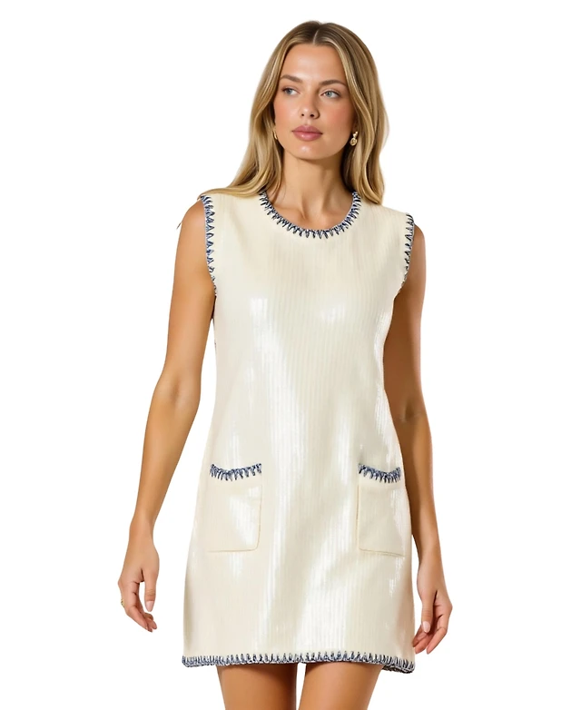 Modenaire Women's Sequin Knit Sleeveless Mini Dress with Contrast Trim and Pockets