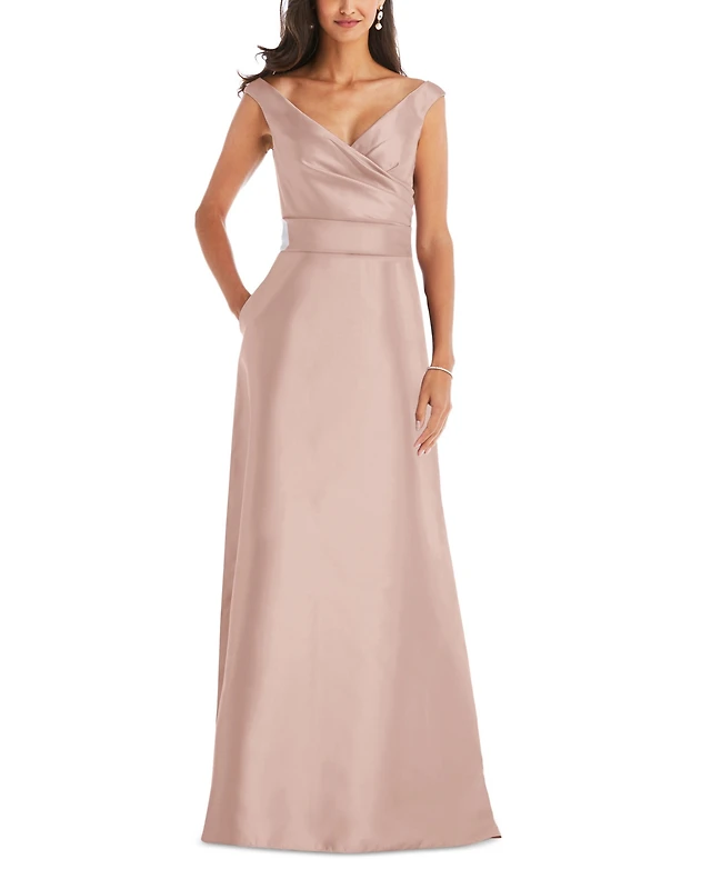 Cynthia & Sahar Women's Shirred Shoulder Stretch Satin Mermaid Dress with Slight Train