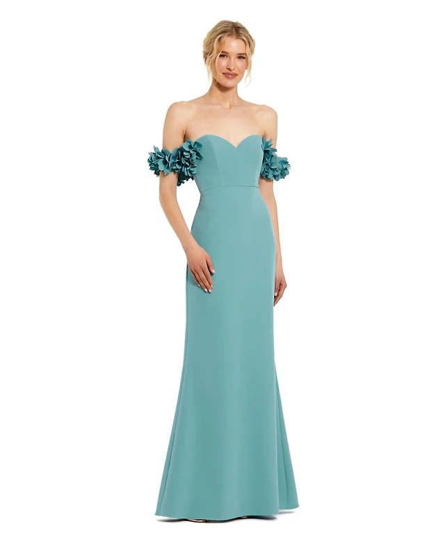 Off-the-Shoulder Crepe Gown with 3D Floral Applique