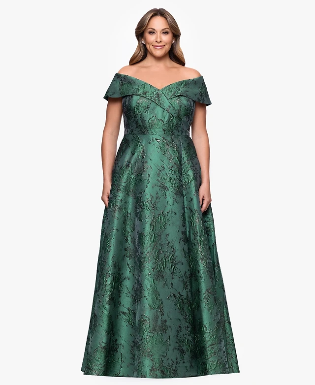 Xscape Petite Long Off-The-Shoulder Brocade Side Ruffle Gown