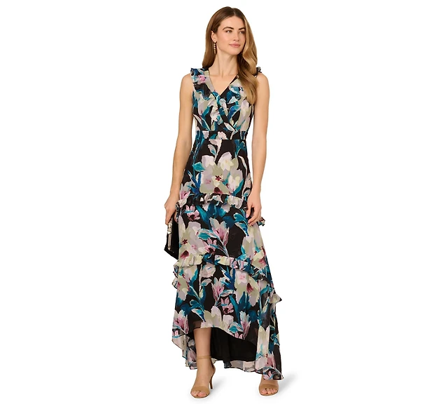 Mac Duggal Women's Sleeveless Floral Midi Dress with Tiered Ruffles