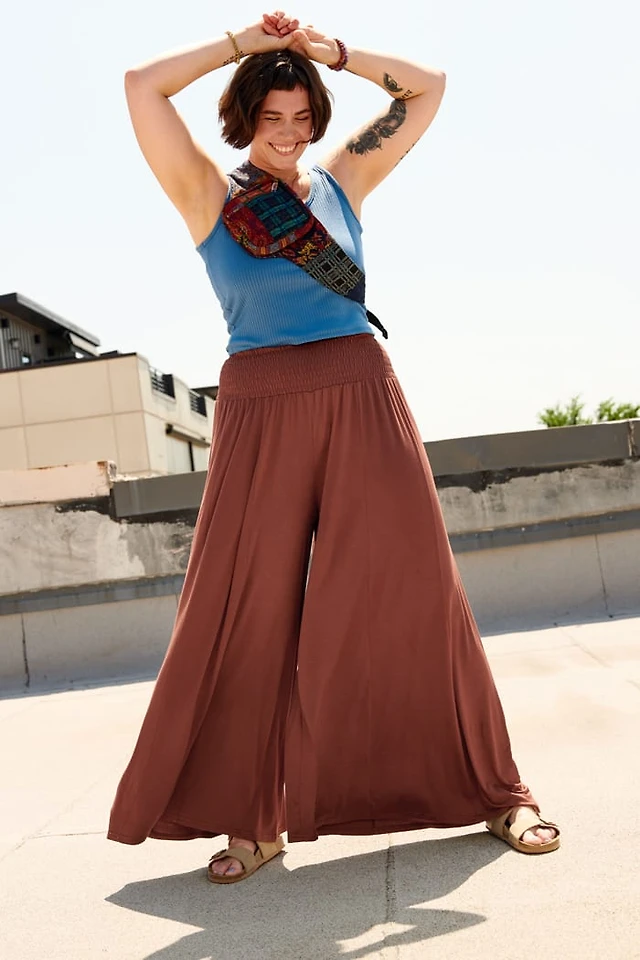 Crimson Sari Wide Leg Pants are designed with a flat front waistband and stretchy shirred elastic the back, they offer flattering fit that moves you.