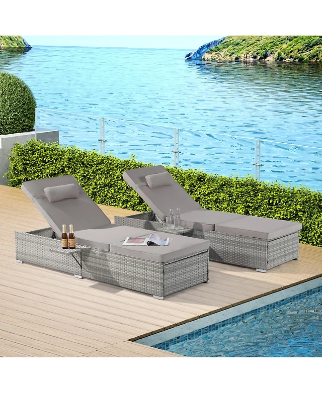 Outdoor Chaise Lounge Chair Set of 2 with Patio Pool Chairs Tanning Lounges for Outside,Beach Rattan Recliners with Adjustable Backrest, Table, Cushio