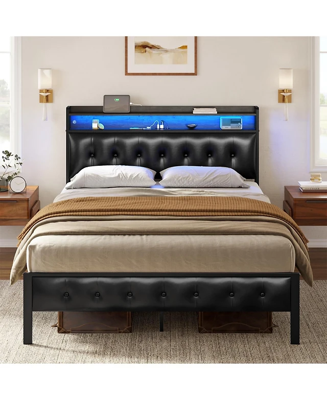 gaomon Queen Bed Frame with Charging Station, Led Bed Frame with Storage Headboard, Upholstered Platform Bed Frame