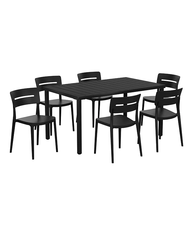 Seven Piece Patio Table Set With Metal Tempered Glass Top And 6 Flex Comfort Stacking Chairs