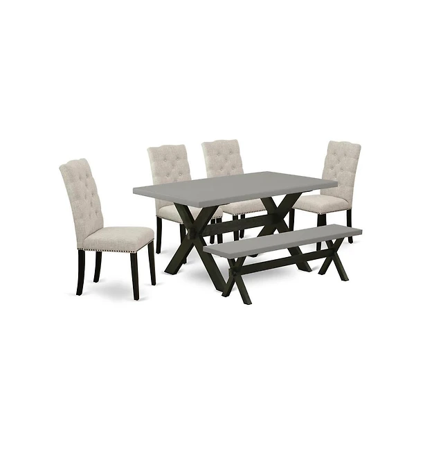 East West Furniture 6-Piece Wood Dining Table Set-Pond Linen Fabric Seat and Button Tufted Chair Back Kitchen chairs, A Rectangular Bench and Rectangu